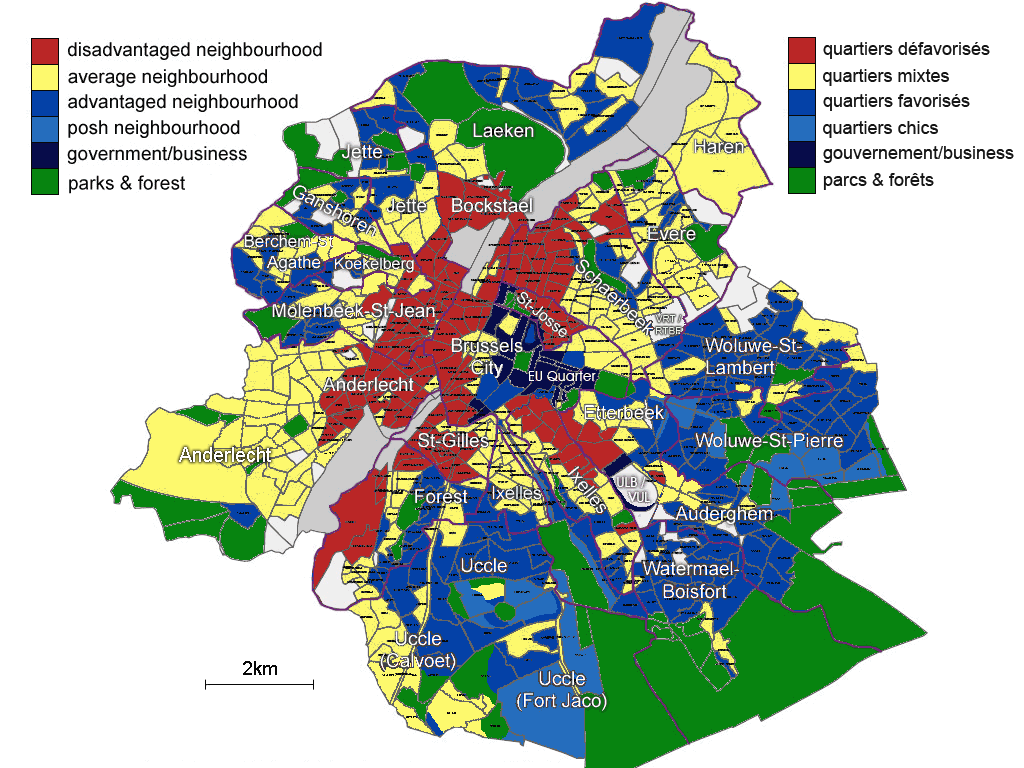 Los barrios en rojo son los más conflictivos, de mayoría musulmana, los amarillos son obreros más tranquilos y mixtos en cuanto a su población, y los azules son más ricos y mayoritariamente belgas.